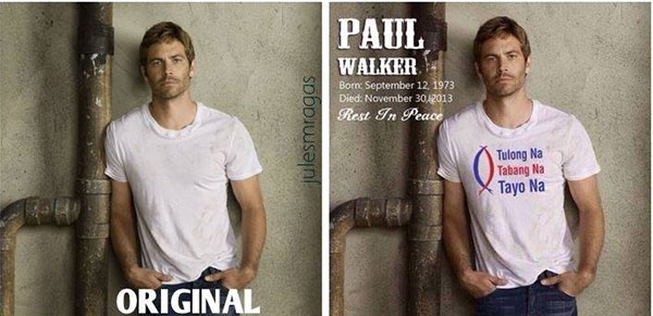 Paul Walker, bless his soul, has not been to the Philippines (though some of Fast & Furious 6 cast members have) and we’re quite sure that he doesn’t own a “Tulong Na, Tabang Na, Tayo Na” t-shirt either.