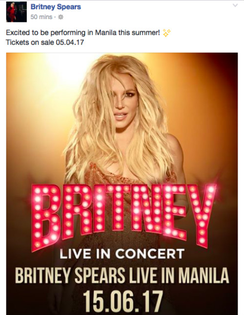 According to Britney’s post, she will perform at the Mall of Asia Arena on June 15, 2017. Tickets will go on sale May 4.