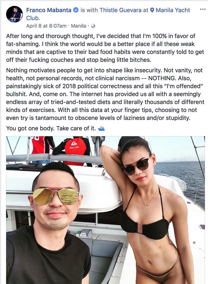 In a now-deleted Facebook post that went viral over the weekend, former Filipino VJ turned political blogger (and staunch supporter of Philippine President Rodrigo Duterte), Franco Mabanta said that he is now in favor of fat-shaming.