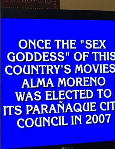 “Once the ‘sex goddess’ of this country’s movies, Alma Moreno was elected to its Parañaque City council in 2007,” the host Alex Trebek asked on the show.