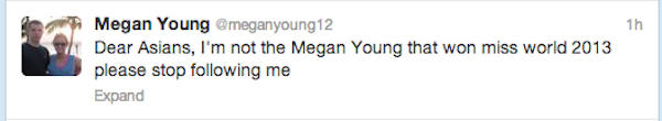 Young’s response? “Dear Asians, I’m not the Megan Young that won miss world 2013 please stop following me.”