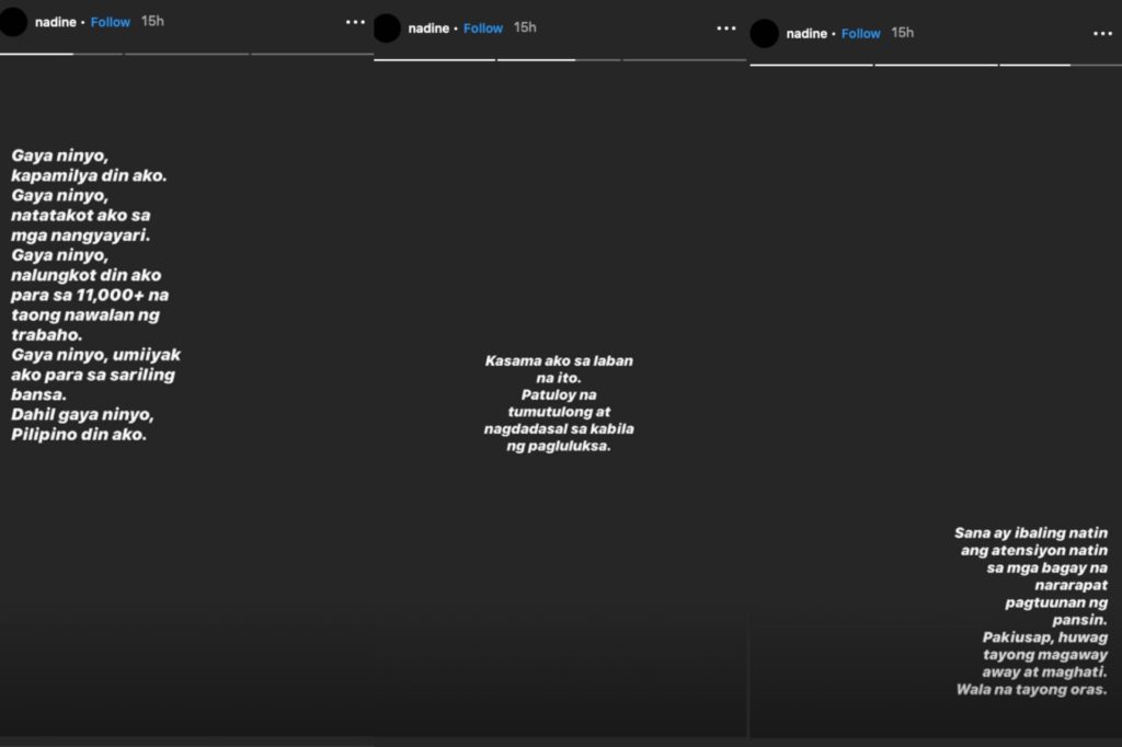 “Like you, I’m scared of what’s happening too. Like you, I’m saddened for the more than 11,000 people who lose their jobs. Like you, I cry for my own country. Because like you, I’m also a Filipino. I am part of this fight. I continue to help and pray [for the situation] amid mourning,” the 26-year-old actress wrote on Instagram.