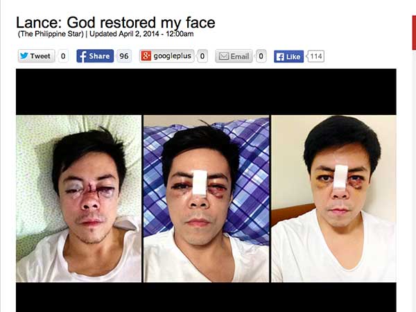 “Only a week after he underwent a five-hour surgery to reconstruct his face crushed by an 80-pound barbell in a freak accident at the gym where he was regularly working out, Lance Raymundo (real full name: Reggie Ramon Raymundo) looks the way he did before that tragic incident,” reports The Philippine Star.