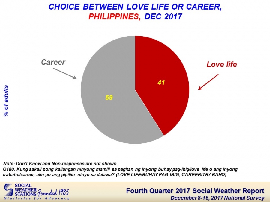 While it seems most Filipinos tend to be hopeless romantics and wear their hearts on their sleeves, a survey released by Social Weather Stations (SWS) yesterday found that most Filipinos, if forced to choose, would pick having a career over a love life.
