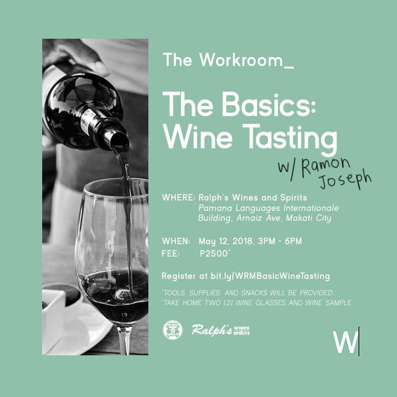 Those who want to up their wine game can start with The Basics: Wine Tasting with Ramon Joseph, which is being organized by The Workroom Manila.