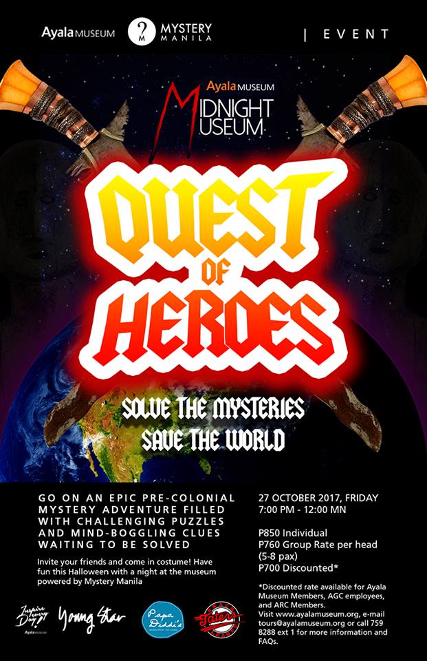 It’s Halloween weekend! If you’re tired of the usual club parties, Quest of Heroes might be the event for you. It’s a mystery game organized by Mystery Manila and Ayala Museum that will have you “solve the mysteries” and “save the world.”