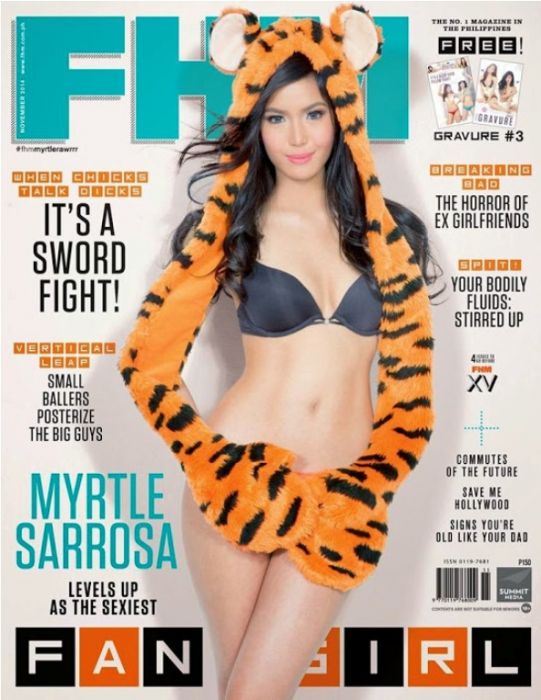 The cover star of the 2014 November issue of FHM Philippines is Myrtle Sarrosa, best known for being that cosplaying chick in Pinoy Big Brother back in 2012.