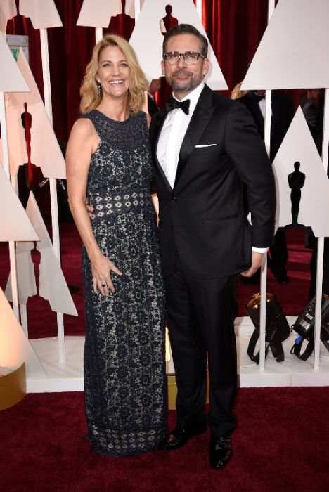 The beautiful wife of Steve (he is known for mostly comedy films such as The 40 Year-Old Virgin and Bruce Almighty) looked really elegant in the dark blue dress with intricate details.