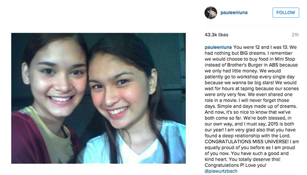 Pauleen Luna has always been a big supporter of her BFF, Pia Wurtzbach. She’s always posted photos and messages of support on Instagram, cheering Wurtzbach on for her Miss Universe endeavor.