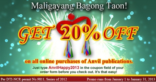 Good news, booklovers: Anvil Publishing Inc. has an online book sale. The thing is that it’s up only until the end of the month. So make sure you go to their website (which is new, btw) if you want to avail of the 20 percent discount, which is applicable on all Anvil children’s books, cookbooks, novels and reference books. Some of the writers with books included in the sale are Fr. James Reuter, Ambeth Ocampo, Pol Medina, Jessica Zafra, Jaime Licauco, Cory Quirino, Randy David, Queena Lee Chua, RJ Ledesma, Msgr. Socrates Villegas, Claude Tayag and Nora Daza.