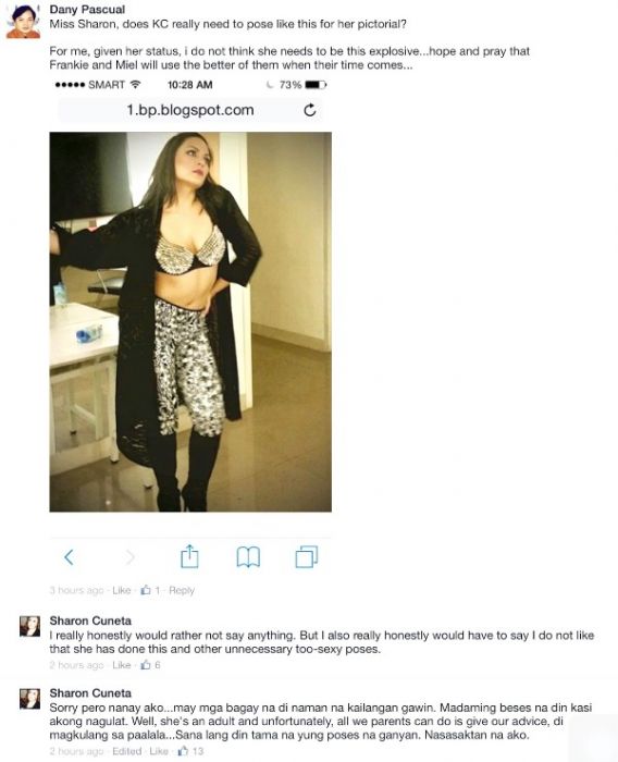 Recently, a Facebook user named Dany Pascual asked Ate Shawi what she thinks of KC’s sexy outfits and poses for a recent pictorial, even attaching a photo as proof.