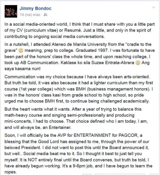 Anyway, Jimmy posted his statement on his social media pages. He began his message to his detractors by writing, “In a social media-oriented world, I think that i must share with you a little part of my CV (curriculum vitae) or resumé.” He then proceeded to tell them that he got his education from the Ateneo de Manila University “from prep to college.” He graduated with an AB Communication degree in 1997.