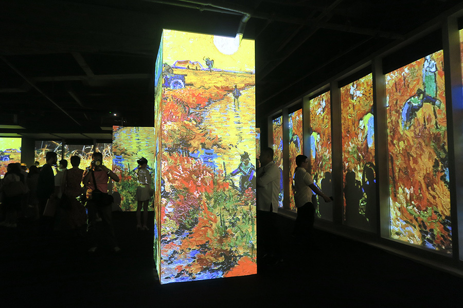 As a preamble to the main multi-sensory experience, visitors pass through a room hung with replicas and informational blurbs covering a handful of Van Gogh’s more than 2,100 artworks, which in the painter’s own time were mostly uncelebrated oil paintings produced in the last two years of his life. (Van Gogh only catapulted to renown after his death.)