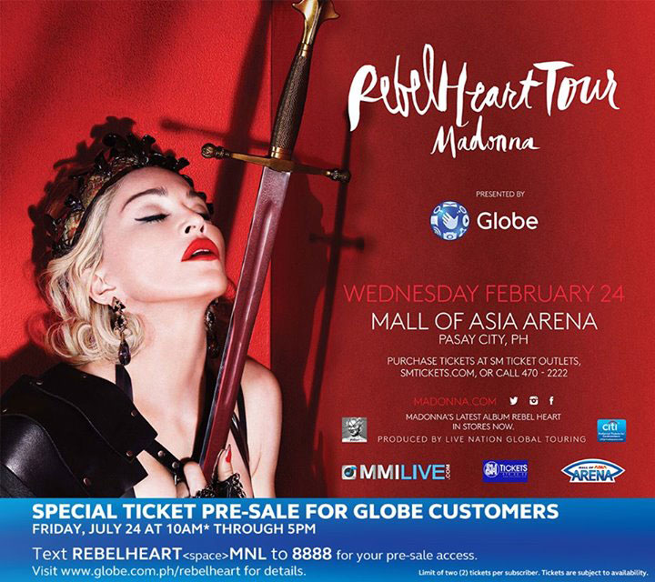 Meanwhile, Globe, a major sponsor of the show, has also disseminated information for their customers, who will be getting presale ticket advantage on July 24. For pre-sale access, Globe subscribers will have to text REBELHEART <space> MNL to 8888.