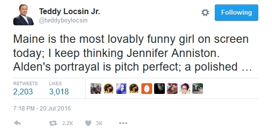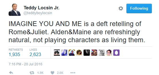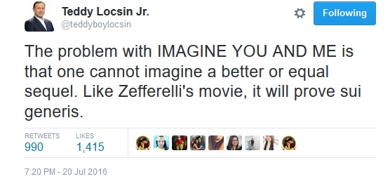 In a series of tweets posted on Wed, Jul 20, Locsin shared his glowing review of the AlDub movie, Imagine You and Me.