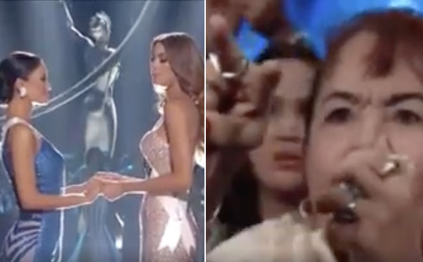 Using iMovie and other media player programs on his Macbook, Facebook Kish Siojo skillfully inserted clips of Mommy Dionisia giving the hex finger during the Pacquiao-Bradley fight last year into yesterday’s Miss Universe coronation night flub, where the host initially announced the wrong winner.