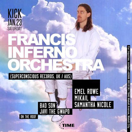 Jan 23. Francis Inferno Orchestra is a DJ from London who’s been spreading the groove in Melbourne. On Saturday, he’ll be spinning at Time Makati along with Malasimbo festival director Miro Grgic, Javi Vargas, Samantha Nicole and more. 10pm. 7840 Makati Avenue, Makati. +63906 2658136