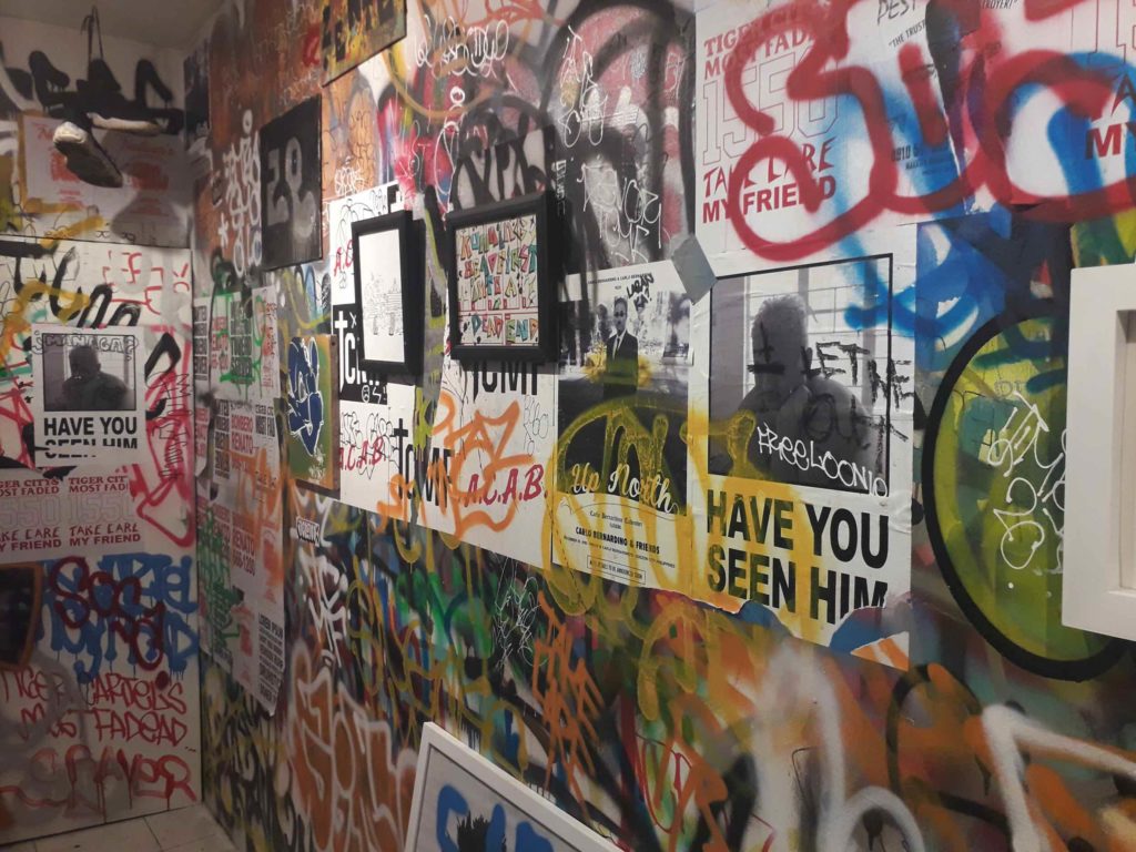 The 15-man artist exhibit sees the gallery’s walls covered with spray-painted graffiti tags, pasted-on zines, and DIY posters, alongside framed pop art. Mixed-media installations are also on display as a skate video plays on a loop. Works from local graffiti artists Glimp, Sasagasa, Toyo, Imbuh, Zente, and Tsarlyboy, among others, are on view.