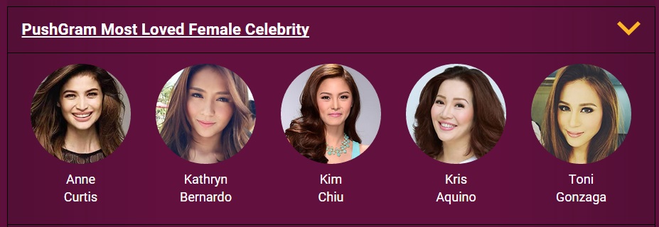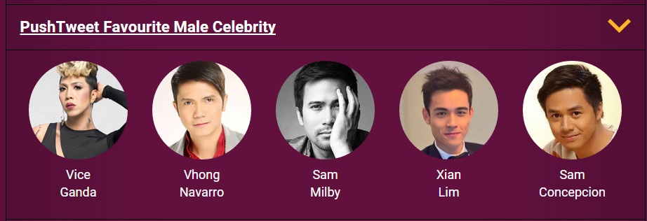 Entertainment website PUSH.com.ph will lead the hat tip on the Most Liked Male and Female Celebrity, Most Liked Group or Tandem, Most Liked Music Artist, and Most Liked Newcomer, and Favorite Newcomer based on Facebook and Twitter popularity.