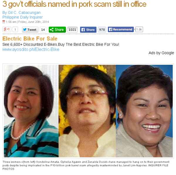 “Three women have managed to hang on to their government posts despite being implicated in the P10-billion pork barrel scam allegedly masterminded by Janet Lim Napoles,” reports Gil C. Cabacungan in Philippine Daily Inquirer.