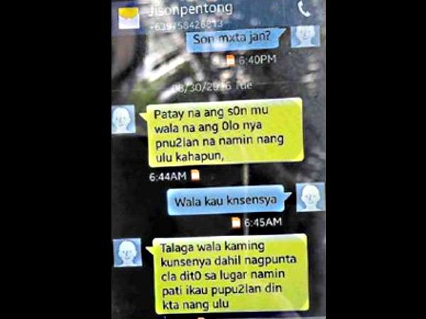 Most likely it was from an Abu Sayyaf member, who texted, “Patay na ang son mu, wala na ang ulo niya, pinutulan na namin ng ulo kahapon,” according to Philippine Daily Inquirer. (“Your son is dead, we beheaded him yesterday.”)