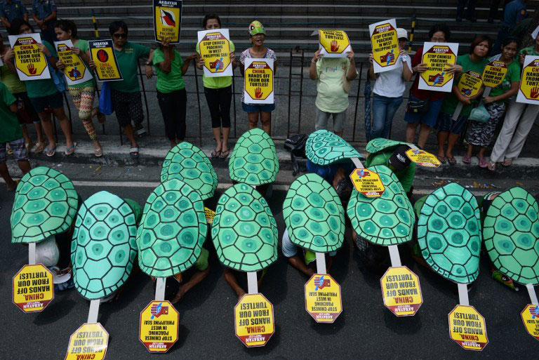 The protesters, some wearing green cardboard cut-outs of turtle shells, carried placards that read “Vietnam-Philippines join hands to kick off China”, “China Stop Bullying Vietnam and the Philippines” and “We Support Vietnam”.