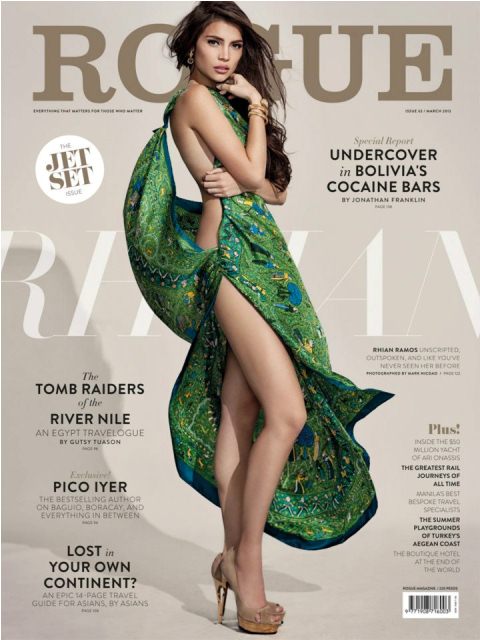 Once again, Rogue magazine comes up with a classy yet sexy cover, this time with the beautiful actress Rhian Ramos. Clad in a bandana-inspired dress, the actress flaunts her very sexy figure – especially her long legs – on the cover of the magazine’s March issue. The facial expression is priceless. The dress is va-va-voom. The shoes are fabulous. The font styles are class. Looks like a worthy buy.