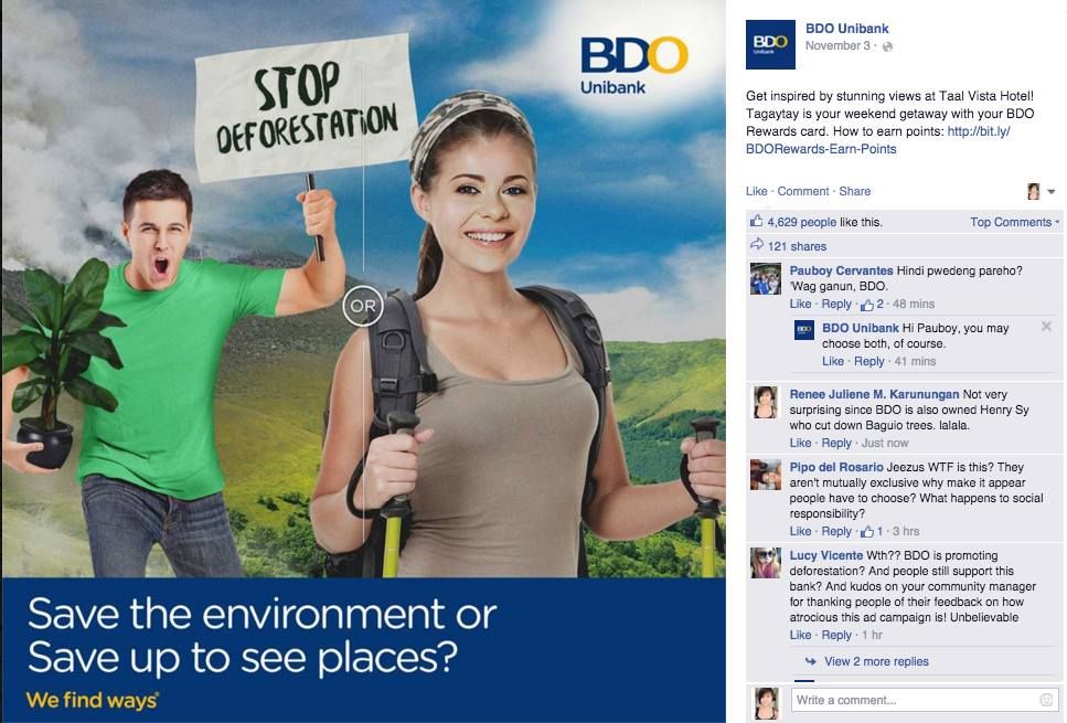 “I’m putting it back so that we can all have a record of how shitty this company is (and the owners of the company),” Renee Karunungan said when she posted one of the ads, which gave the reader two options: “Save the environment or save to see the world?”