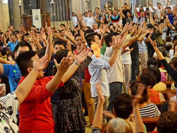 Parishioners of Our Mother of Perpetual Help National Shrine were in for a surprise treat this afternoon from the Cultural Center of the Philippines. To mark its 44th anniversary, the arts organization staged a flash mob. The Philippine Madrigal Singers snuck in before the 11.45am mass and just when it was about to end, Father Ino Cueto asked the parishioners to stay on. That’s when the Madrigals, who were seated near the altar, started singing and dancing to “Hibang sa Awit” by Ryan Cayabyab. They were joined by other choir groups who were strategically scattered around the building.