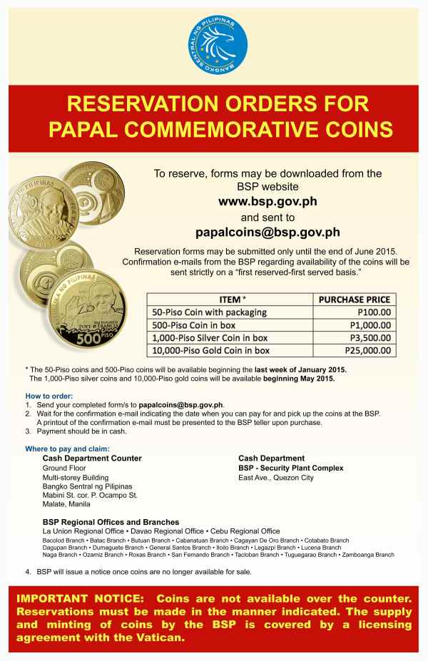 The BSP pointed out: “To reserve, forms may be downloaded from the BSP website, www.bsp.gov.ph, and sent to papalcoins@bsp.gov.ph. Please wait for a confirmation e-mail with the date when you can pay for and pick up the coins at the BSP. Please note that the coins are not available over the counter. Reservation forms may be submitted only until the end of June 2015.”
