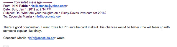 The opinions came surprising, entertaining, and strong. Roxas has since said “thanks but no thanks”—at least that’s what we thought we heard—but wow, Coconauts! You have something to say, no?