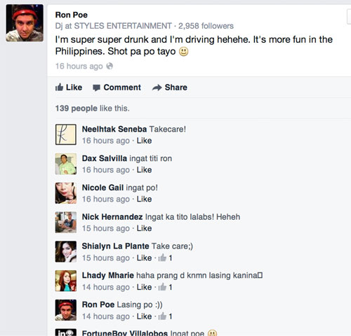 Earlier Friday afternoon, your brother Ron Poe updated his status on Facebook about his drunk driving. Kindly see above.