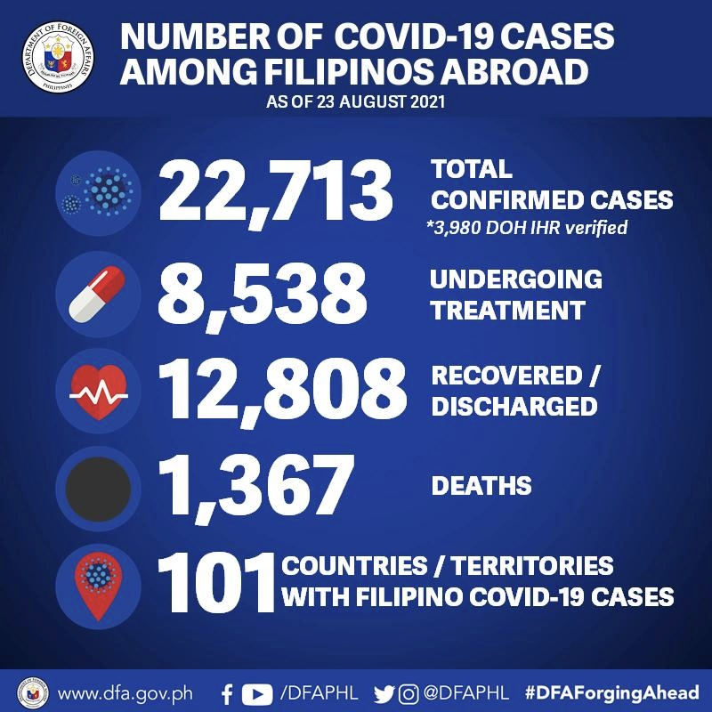 After weeks of relatively few cases, the August 23 advisory from the Department of Foreign Affairs (DFA) shows a very sharp rise in the number of new Covid-19 cases among Filipinos abroad: 946 last week, compared to 36 reported on August 16 and 89 on August 9. This represents an increase of over 2500% over the previous week.