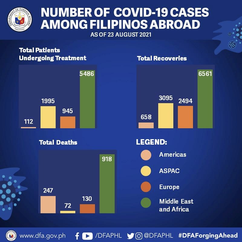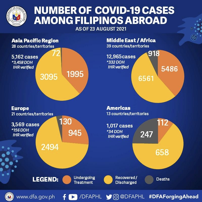 While the DFA did not release any specifics, their advisory also noted that Europe was the only region not to have any new cases. The highest number of new cases came from the Middle East and Africa, while the Asia-Pacific region had the highest number of deaths and recoveries.