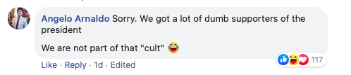 Filipinos, meanwhile, like user Angelo Arnaldo, were quick to respond, “Sorry. We got a lot of dumb supporters of the president. We are not part of that ‘cult’.”