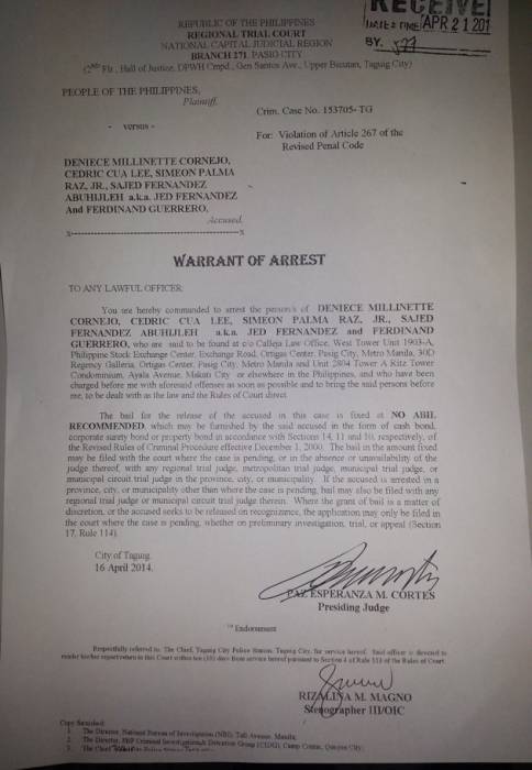 The image of the warrant of arrest for the serious illegal detention charge against Cedric Lee, Deniece Cornejo, Simeon Raz, Jed Fernandez, and Ferdinand Guerrero proves this.