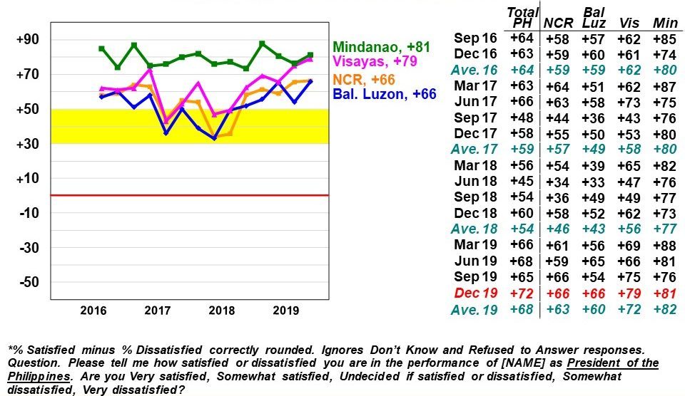 According to the Social Weather Stations’ (SWS) 2019 fourth-quarter survey, conducted between Dec. 13 and Dec. 16, 72 percent of adult Filipinos surveyed were satisfied with Duterte’s performance as president — a rating classified by SWS as “excellent” — with only 10 percent dissatisfied and 8 percent undecided. The remaining 10 percent declined to answer.