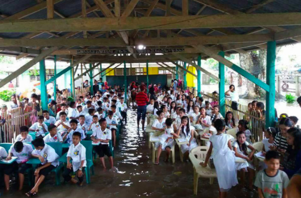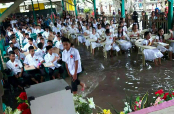 About fifty graduating boys and girls of Balas Elementary School in Lamitan City, Basilan had to take their shoes and socks off to attend the swamped ceremony.