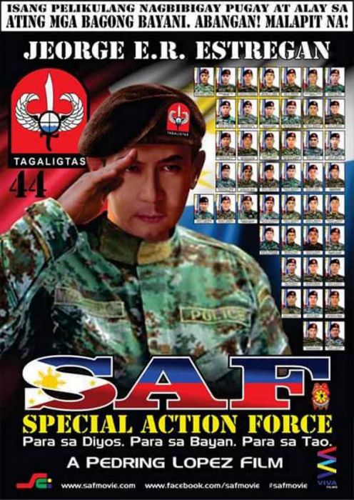 The report noted: “Ejercito, who is also known by his screen name Jeorge Estregan, shared a poster of the movie titled, SAF, on his official Facebook page. The film, to be directed by Pedring Lopez, has the tagline ‘Para sa Diyos, Para sa Bayan, Para sa Tao.'”