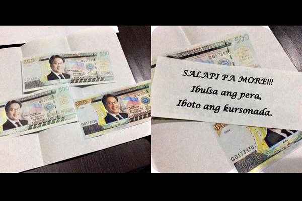 The report noted: “The anti-vote selling fliers were contained in white envelopes and sent via postal mail to the House of Representatives’ Media Office Affairs. The fliers bore the message ‘SALAPI PA MORE!!! Ibulsa ang pera, iboto ang kursonada (More cash!!!Take the money, but vote for who you really want)’ and three PHP500 bills bearing the face of Roxas.”