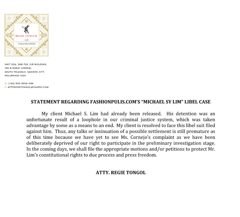 On Fri morning, Aug 14, a statement from his lawyer, Atty. Regie Tongol, was posted on the blog.