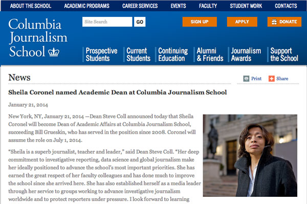 According to the school’s website, it was Dean Steve Coll who made the announcement today. Coronel, co-founder and director of the nonprofit Philippine Center for Investigative Journalism, “will assume the role on July 1, 2014.”