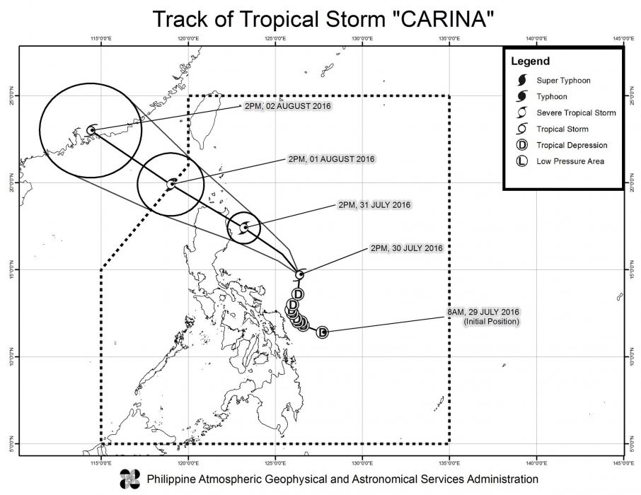 According to PAGASA, ‘Carina’ is expected to make landfall in Aurora by Sunday night or Monday morning.