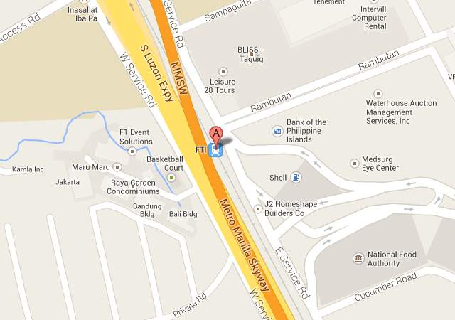 The FTI is situated about 2.4 km north of Bicutan Interchange, 2.3 km southeast of the Fort Bonifacio overpass and about 4.4 km southeast of EDSA. It’s accessible through two major arteries: the South Luzon Expressway and C-5 via SLEX’s East Service Road.