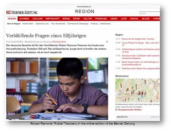 An 11-year-old Filipino boy was recently featured in one of the two leading newspapers in Switzerland for excelling in his Grade 4 class.