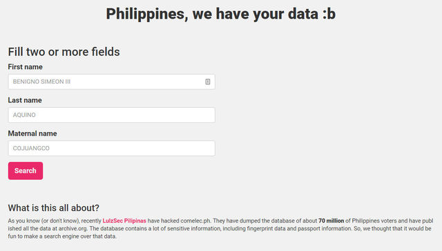 In a statement posted on the search engine’s front page, the group declares, “As you know (or don’t know), recently LulzSec Pilipinas have hacked comelec.ph. They have dumped the database of about 70 million of Philippines voters and have published all the data at archive.org. The database contains a lot of sensitive information, including fingerprint data and passport information. So, we thought that it would be fun to make a search engine over that data.”