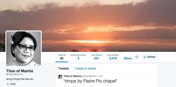 If you’ve been neglecting Twitter in favor of Tinder, well, here’s one good reason to swing by Twitter again: @Titas of Manila is a three-day old Twitter account that celebrates ka-titahan. Her tweets will remind you of your favorite tita, and/or all the things all your titas say and do. It’s not yet viral, but it has the makings of; in her three days of tweeting, @Titas of Manila already has over 3,000 followers.
