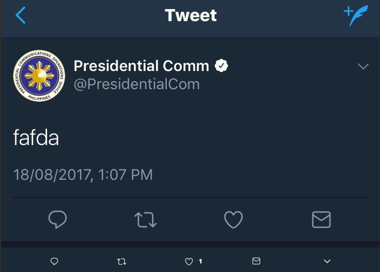 PCOO chief Martin Andanar told reporters that it was a mistake made by one of their Twitter admins. “It doesn’t mean anything, so she deleted it right away. I immediately wrote a memo to all of our social media admins to be more careful,” he said.