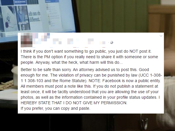“Better to be safe than sorry. An attorney advised us to post this. The violation of privacy can be punished by law (UCC 1-308- 1 1 308-103 and the Rome Statute). NOTE: Facebook is now a public entity. All members must post a note like this. If you do not publish a statement at least once, it will be tacitly understood that you are allowing the use of your photos, as well as the information contained in your profile status updates. I hereby state that I do not give my persmission. If you prefer, you can copy and paste.”