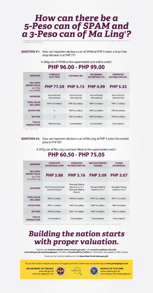 “According to the Bureau of Customs (BOC), some importers have declared that a can of Spam has an import value of just PHP5 when it costs nearly PHP100 at a supermarket,” reports ABS-CBNnews.com.